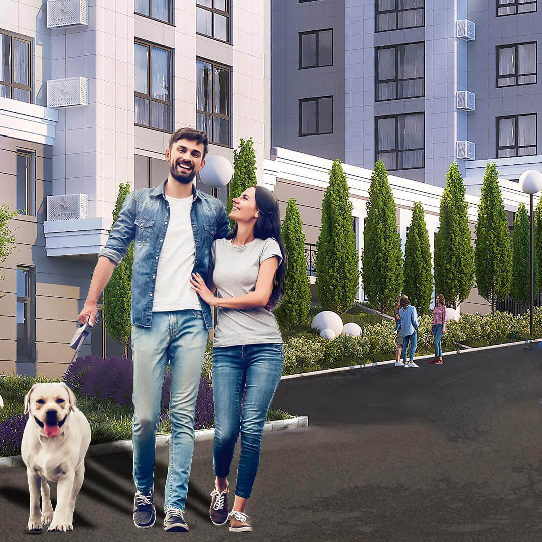 Внутренний двор оформлен с учетом принципов ландшафтного дизайна. Здесь расположены зеленые аллеи, места для отдыха, беседки, зоны барбекю и прогулочные дорожки. Для владельцев домашних питомцев предусмотрены специальные зоны для выгула, что делает проживание в комплексе комфортным и для четвероногих друзей.